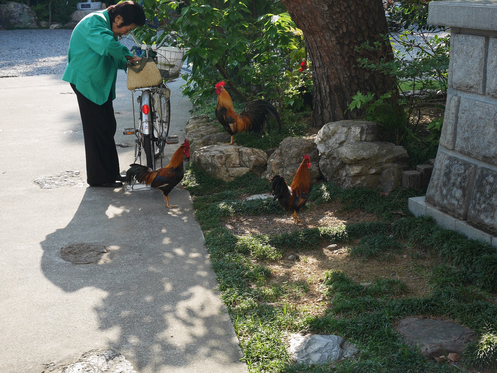 道すがらにあった神社にて、鶏が放し飼いになっていた。餌やり婆さんが敷地外付近で餌を撒き、道路側に誘導しようとしていたのだが、彼らは一向に敷地外に出ようとはしなかった。(我々の見た限りでは。)