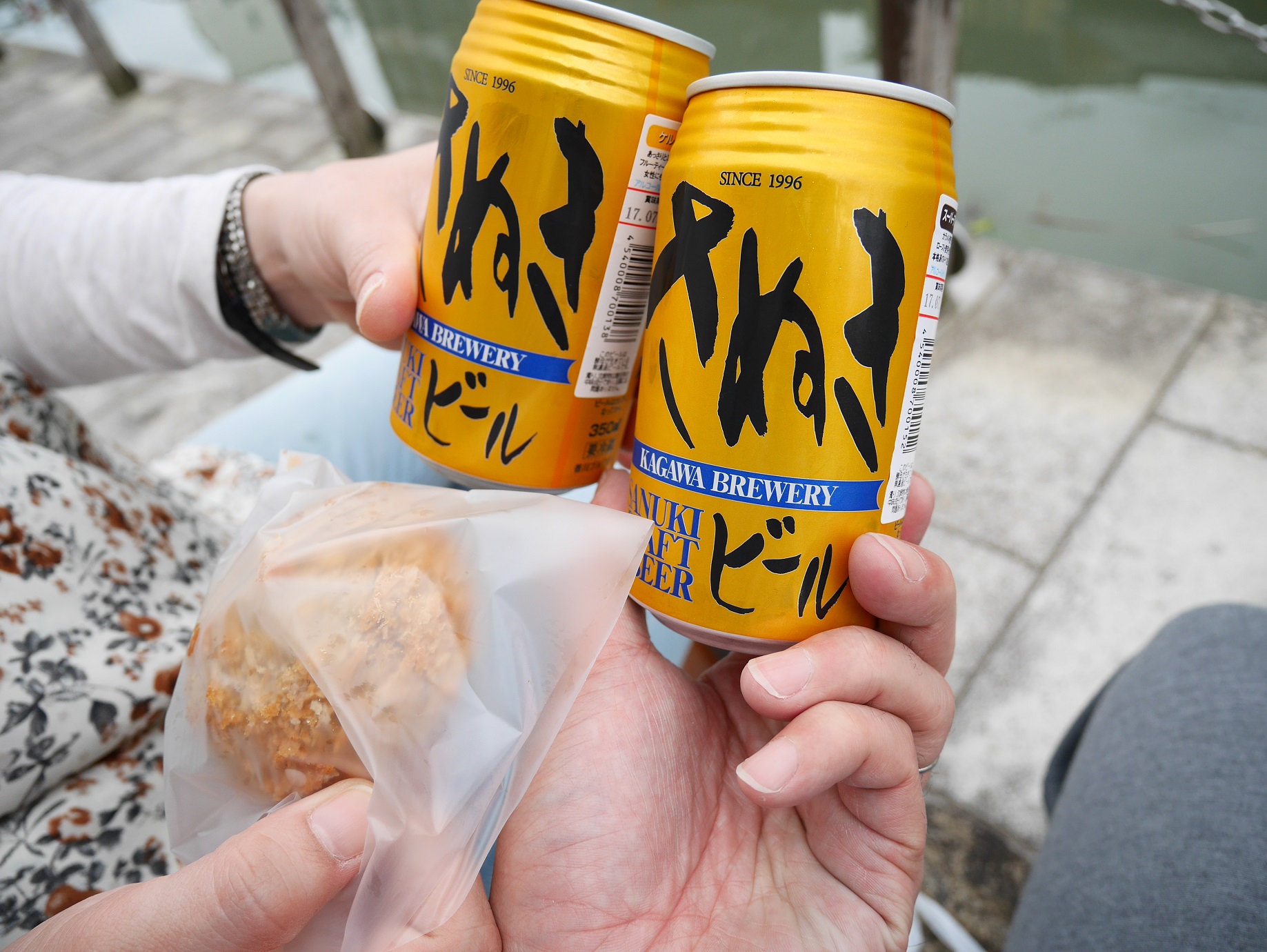 淀んでいる川のほとりにあった石のベンチに座り、本日1回目の乾杯。コロッケはイマイチでしたが、メンチカツとビールは美味でした。