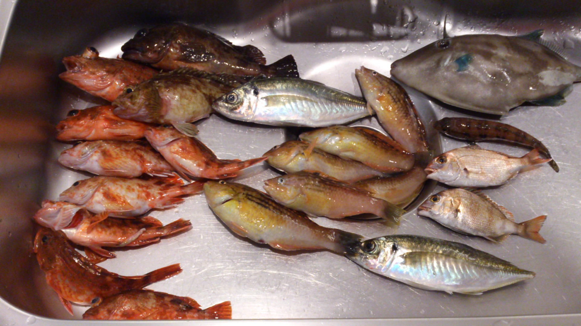 夜釣りの釣果は24センチ位のガシラ一匹のみ。まぁ思ったよりも寒くなく、釣れはしないものの楽しい夜釣りでした。明けて6時に船が沖へ出発。朝一番がまぁ良く釣れるはずなのですが、ものの10分も経たない内に鯵フィーバーは終了。私はその間、最初の一投目にてお祭り・・・完全に地合いを逃してしまいました。それ以降もそこそこ大きいガシラが釣れた程度で、ポカポカ陽気に誘われて眠気に勝てず暫し仮眠。