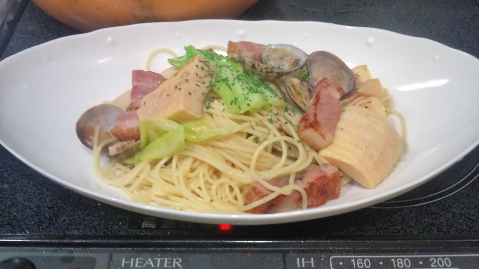 料理は結構上手に出来たんで、記念にアップ。料理名を付けるとしたら、「春キャベツと筍のパスタをアンチョビソースで」