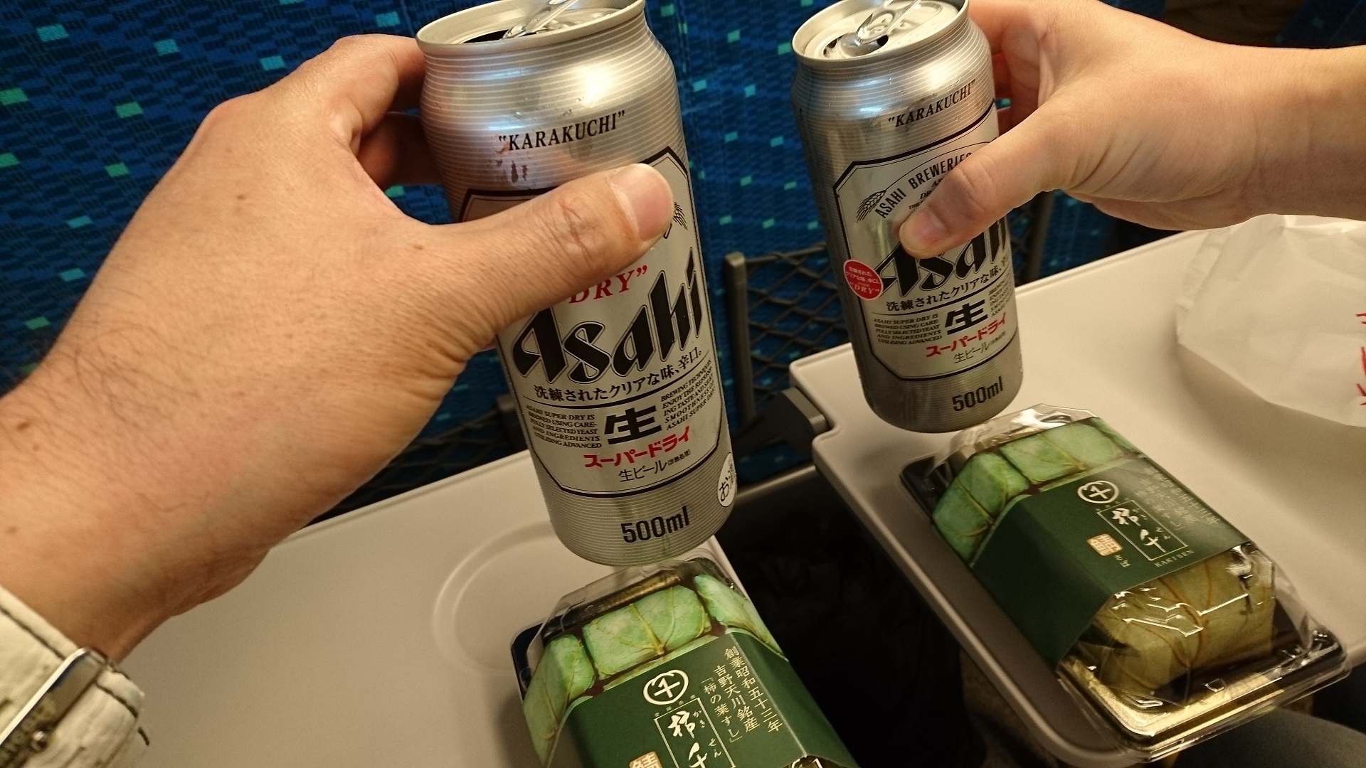 新幹線は予想外にそこそこの混雑具合でした。松山でたらふく美味しいものを食べるために、柿の葉寿司で小腹を満たし、旅行の出発時に恒例にしているビールで乾杯の風景を撮影。いつも出張している広島駅の手前である福山駅で下車。