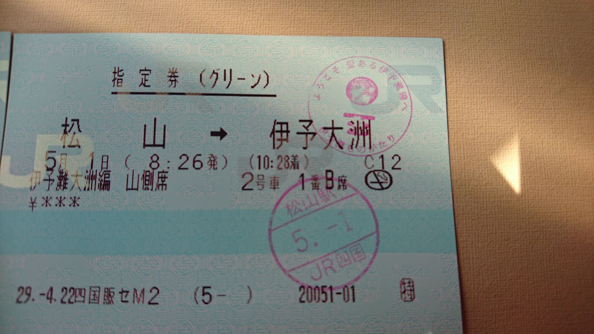 松山駅発の「伊予灘ものがたり 大洲編」午前8時26分発に乗車。予約が遅かったせいか、海側ではなく山側のお席でした。少し残念。