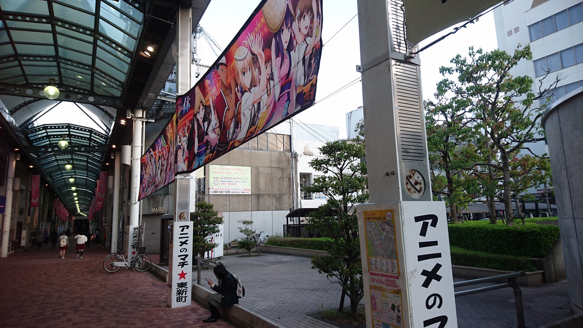 徳島駅から徒歩8分程歩くと商店街の入り口に遭遇。徳島中心市街地はアニメ押し、のようで阿波踊り、阿波尾鶏の次にアニメキャラを描いたノボリに遭遇する街です。