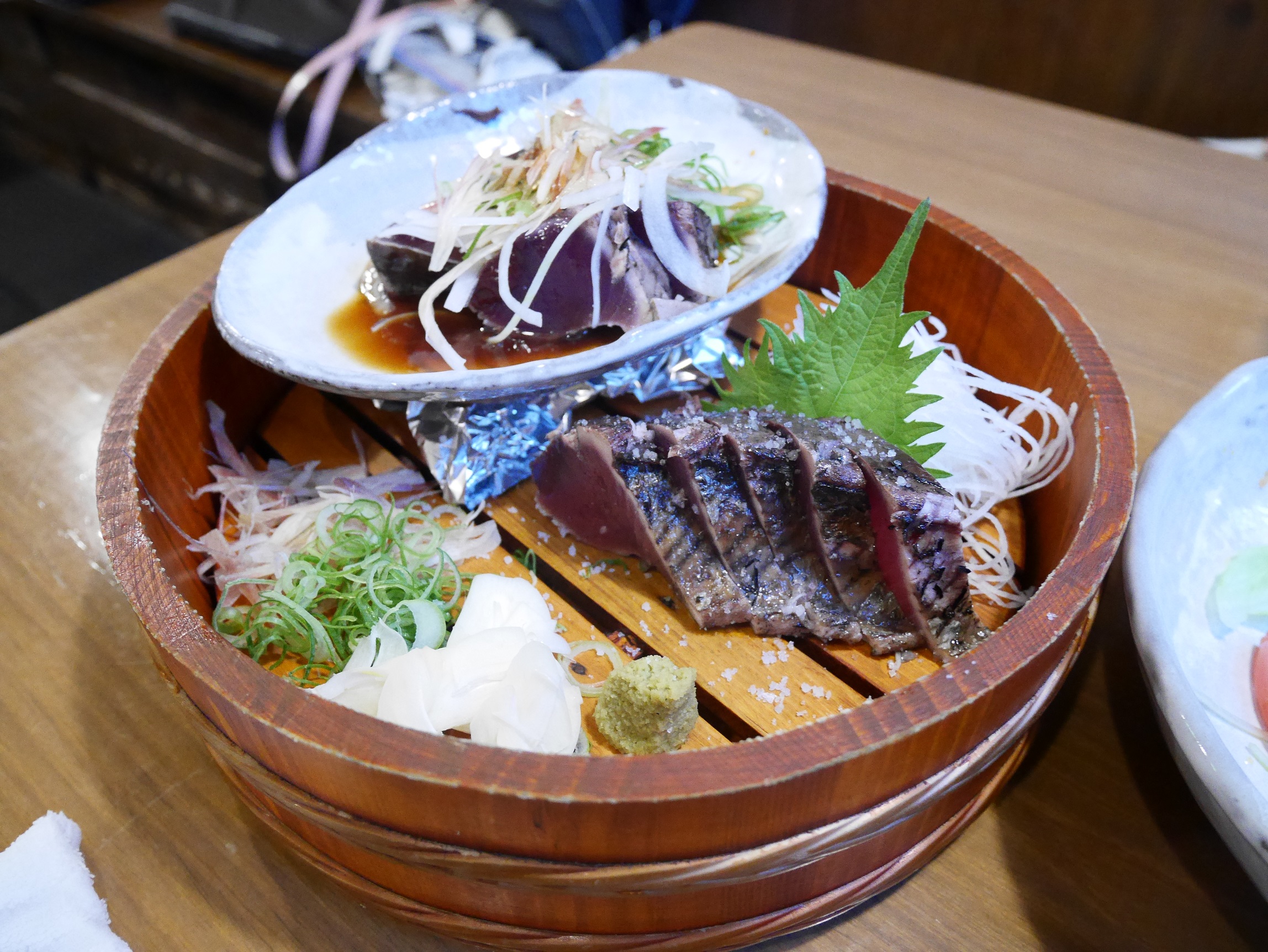 高知での夜メシ。カツオのタタキと塩タタキのセットを注文。夫婦共に断然塩タタキ派なのである。他にも色々食べたが写真はない。撮影せずただ貪り食う。