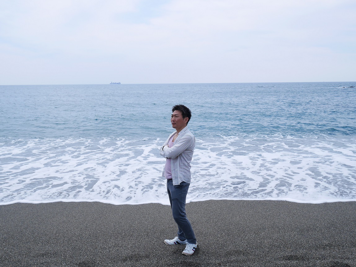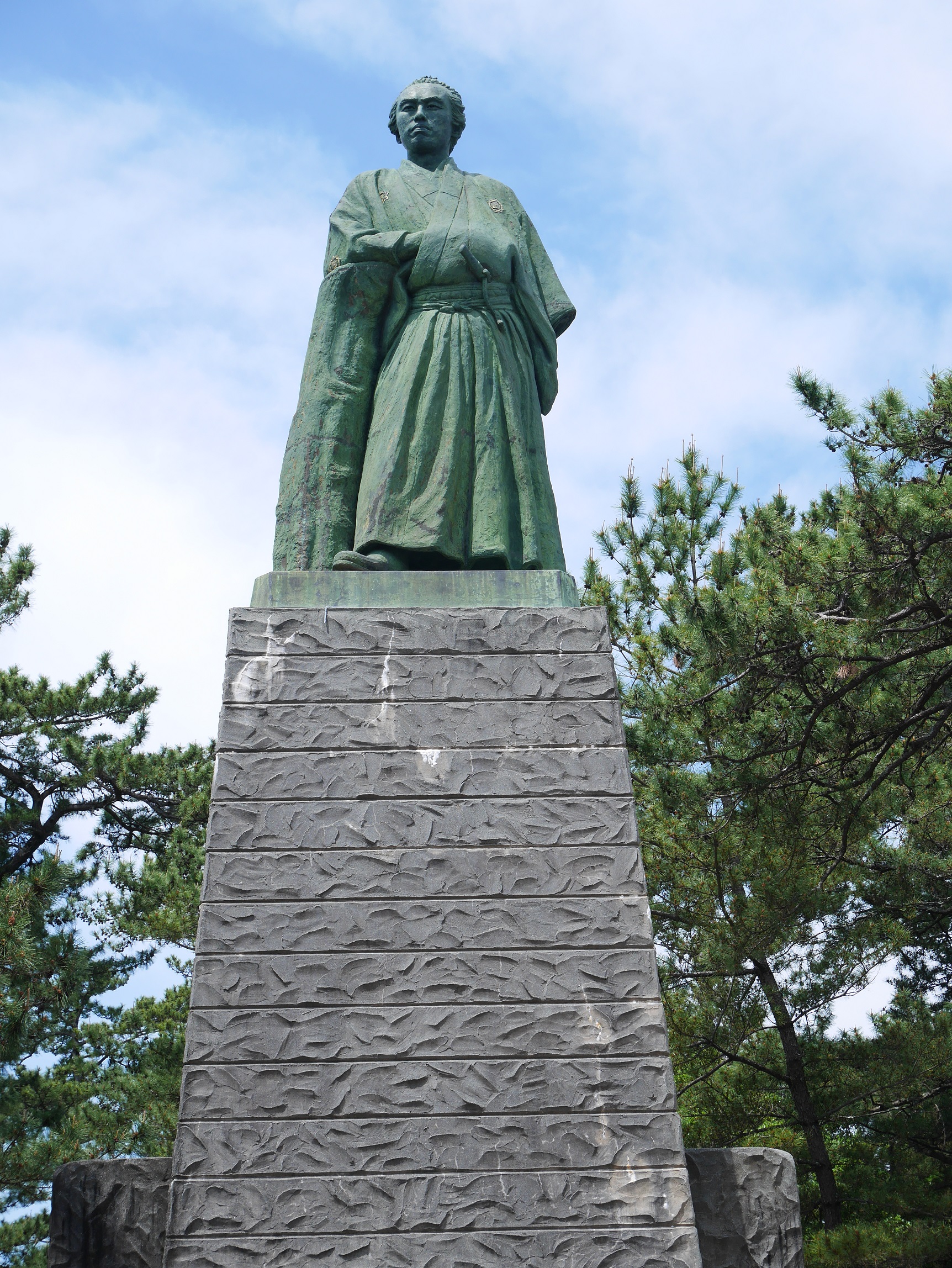 桂浜にきたぜよ。それっぽく浜辺で撮影してもらったけど、写真を見ると龍馬殿は腕を組んでなかった・・・。