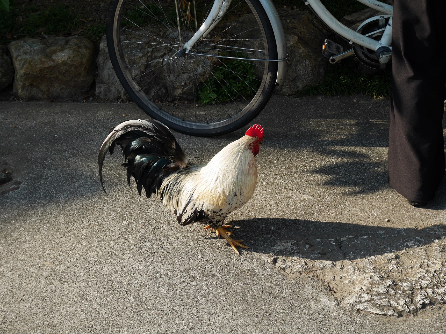 道すがらにあった神社にて、鶏が放し飼いになっていた。餌やり婆さんが敷地外付近で餌を撒き、道路側に誘導しようとしていたのだが、彼らは一向に敷地外に出ようとはしなかった。(我々の見た限りでは。)