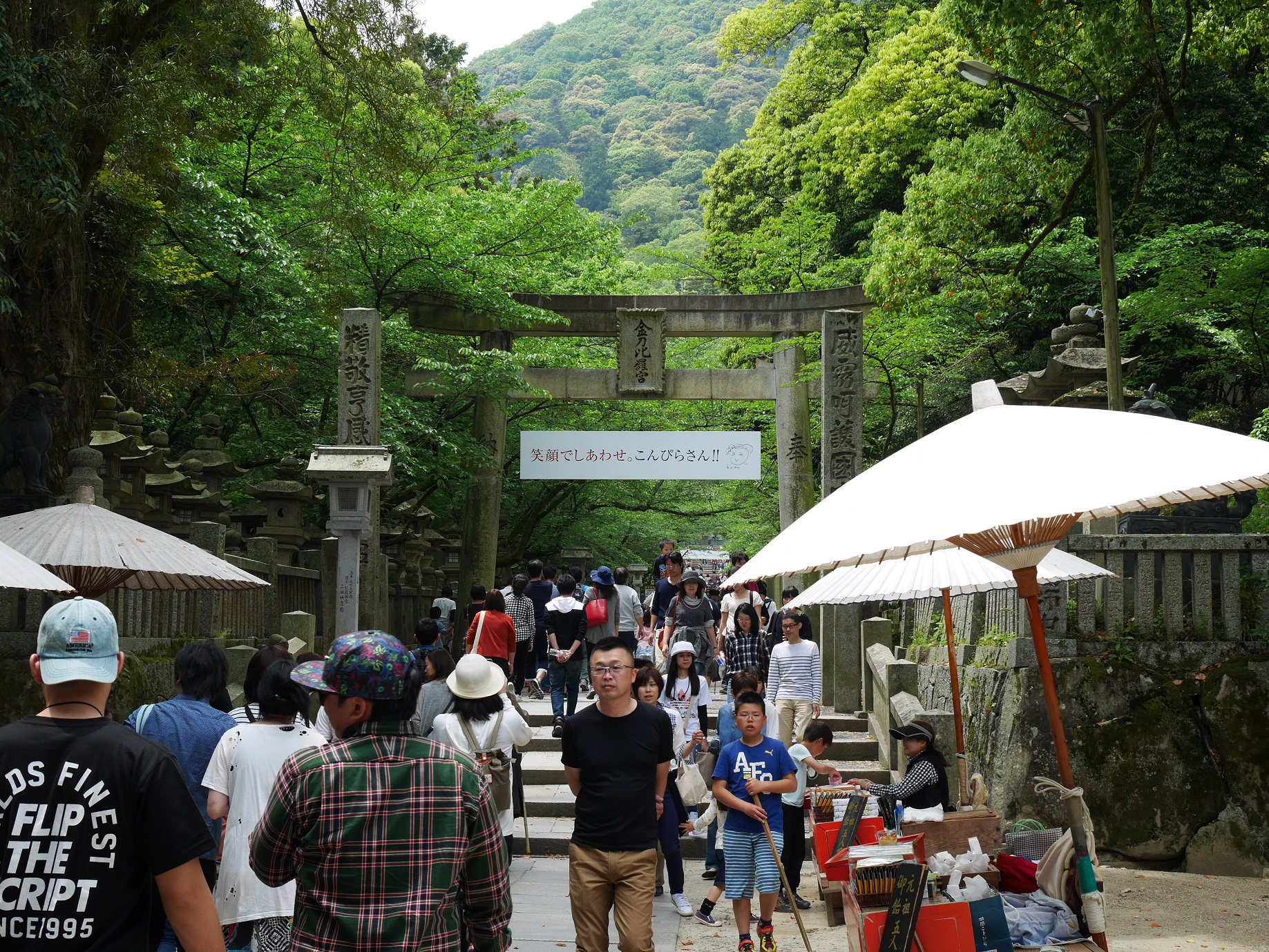 5月3日は祝日との事もあり、観光客で賑わう車両に揺られて高松から琴平まで移動。丸亀ではお城まつりが開催されているせいか、下車する人が多かったのが印象的。この車両にいる人の大半がこんぴらさんに行くもんだと思ってたのでこの混雑が続くだろうと思ってたのに、丸亀過ぎた後は少し落ち着いた車両になりました。