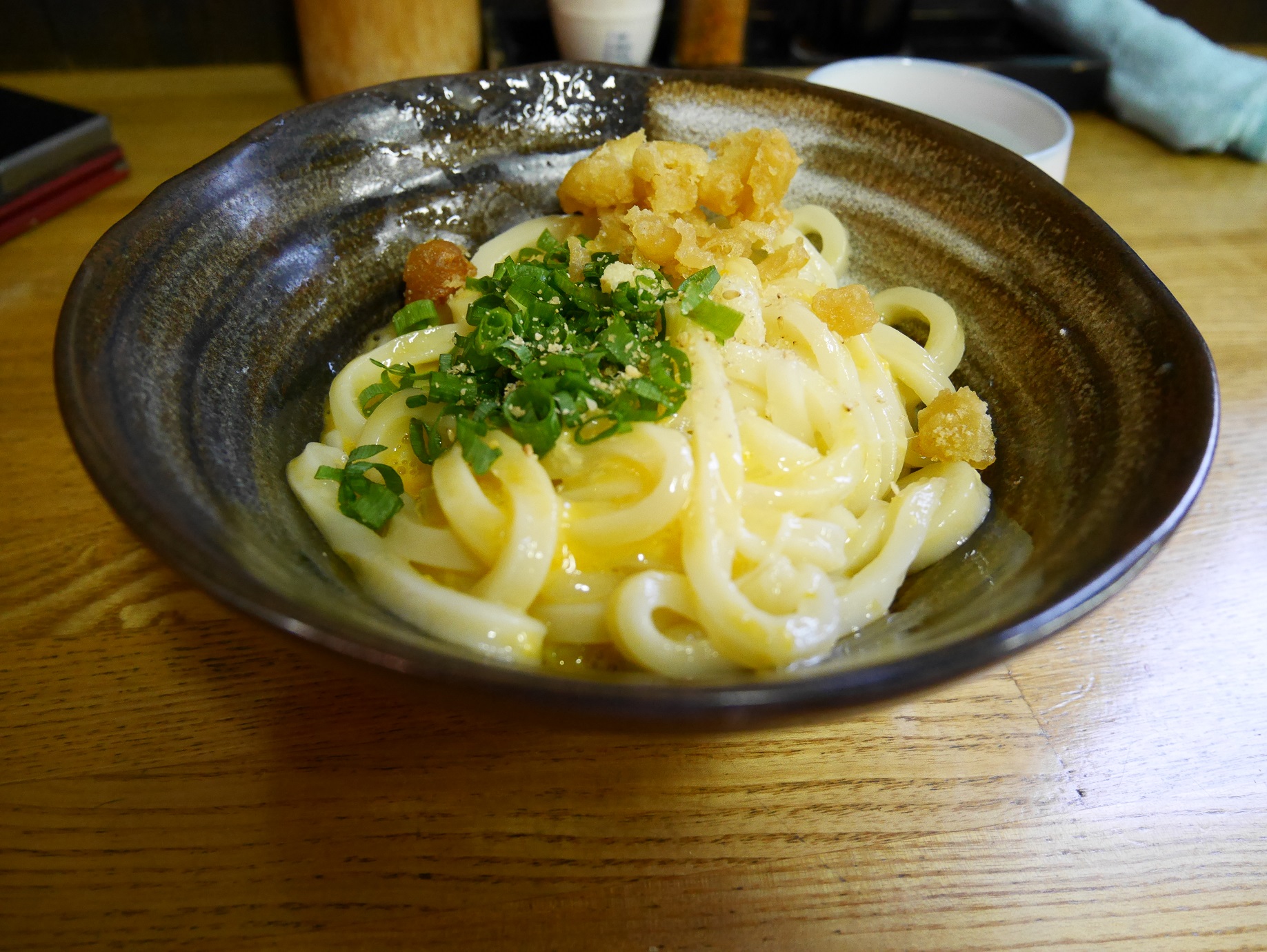商店街を少し歩いた先に民家でやっているセルフうどんやがあったので、妻念願の釜玉うどんを。「お時間10分少し掛かりますけど良いですか?」との事。これで先ほど行ったお店に釜玉や釜揚げうどんがないことを理解する。どうやら回転重視のお店では釜玉・釜揚げうどんは置いてないんだな、という事か。