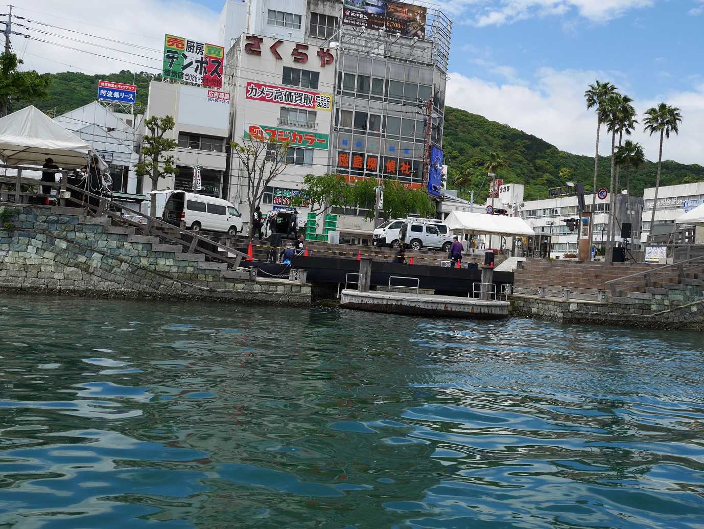 鳴門わかめうどんと鶏天。振り返ってみればなにげに麺類が間食のぞいて4連続なのに気づく。でも美味しかったので気にしない。食後はひょうたん島クルーズへ。