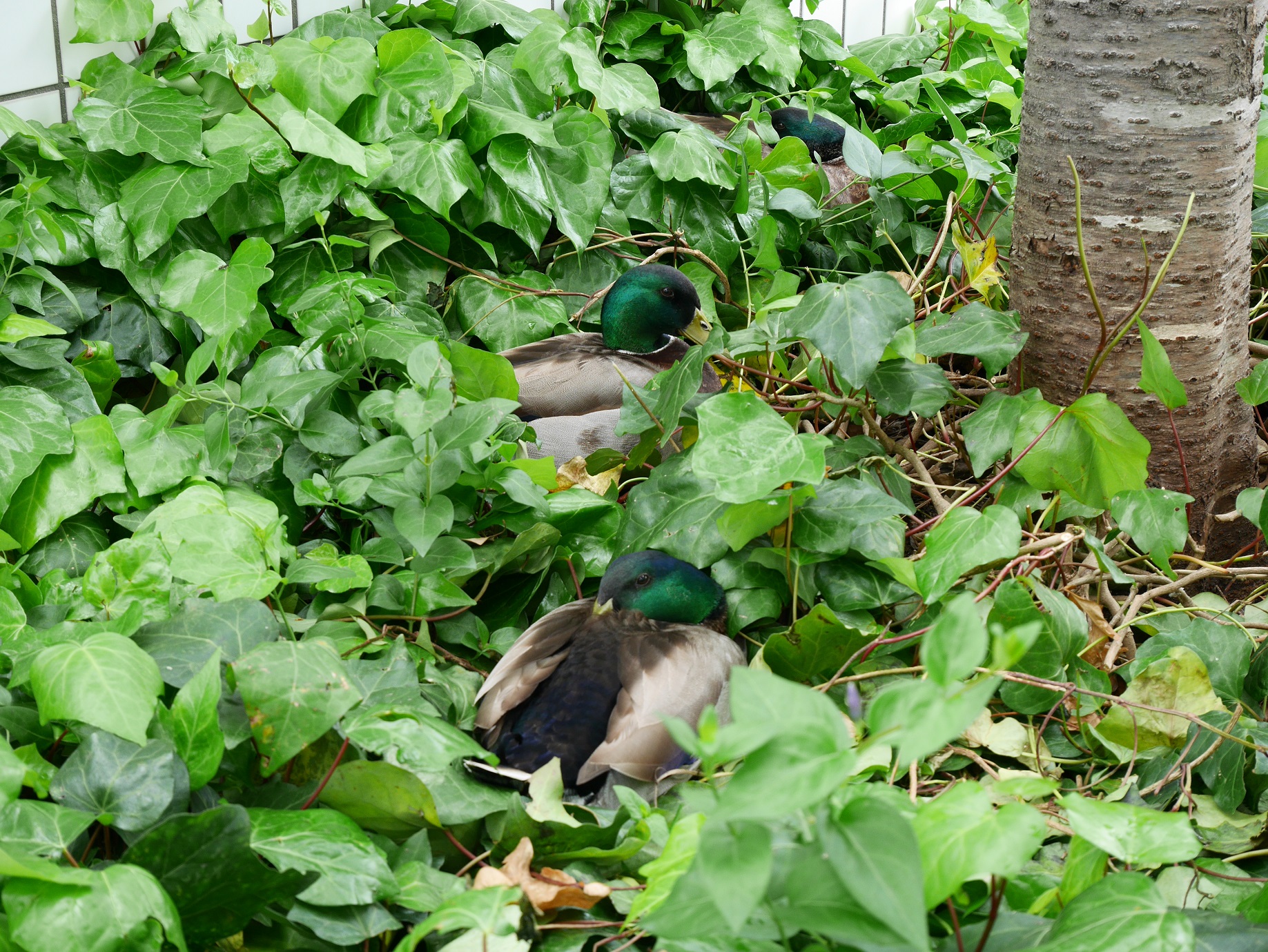 保護色で分かりづらいが野良ガモ?が仲良く寝ていました。