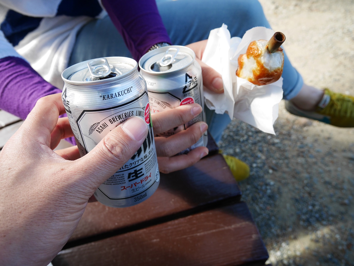 淀んでいる川のほとりにあった石のベンチに座り、本日1回目の乾杯。コロッケはイマイチでしたが、メンチカツとビールは美味でした。