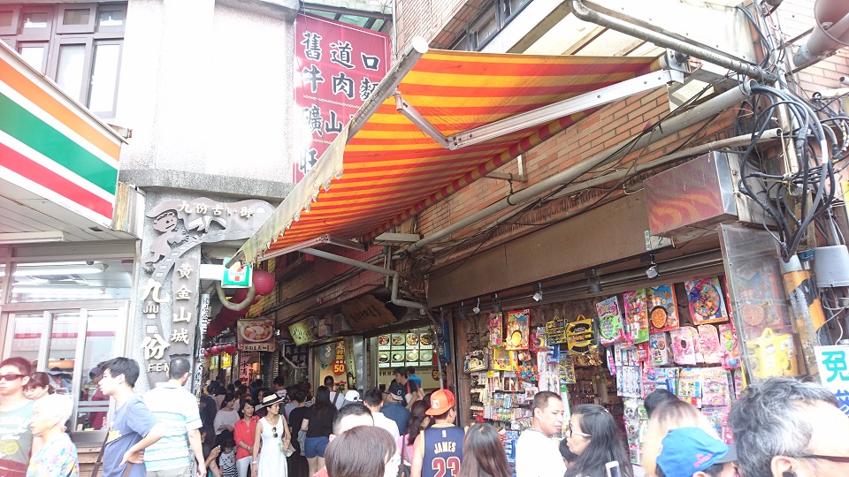 京都の錦市場のように狭い路地にひしめく店舗。お土産物屋さんやスイーツ、臭豆腐といったテイクアウトのお店がびっしり。そこに観光客もびっしり。