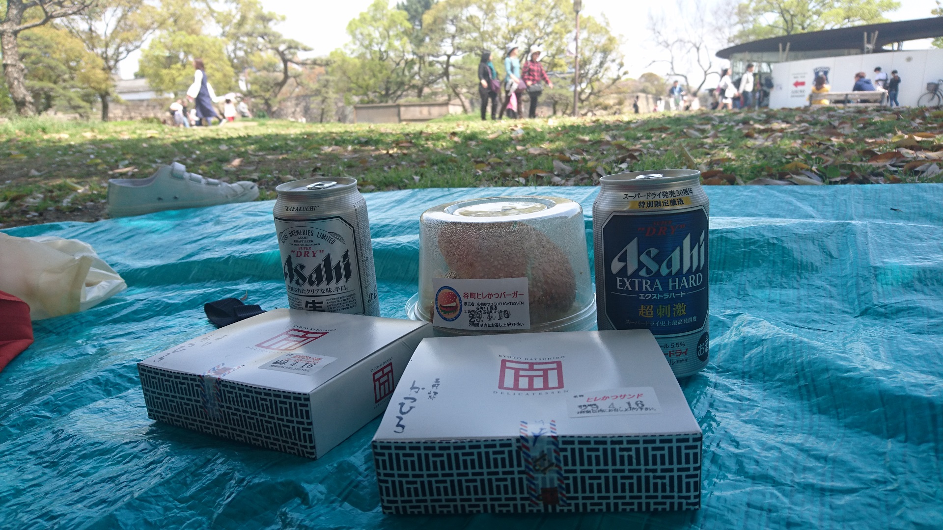 朝から晴天で暑いくらいの陽気につられて、近所の店でカツサンドとハンバーガーをテイクアウトして大阪城公園へ。