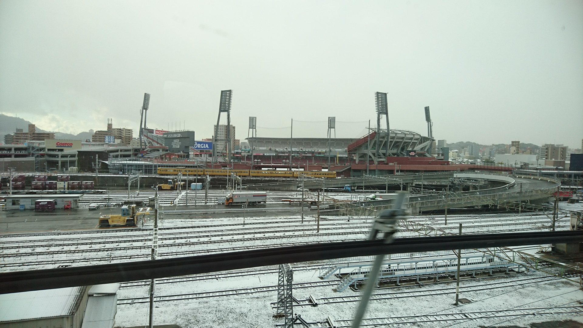 新幹線の車窓(午前10時頃)からみたマツダスタジアム。本日はここで降りず、もうすこし先へ移動ですが、ここから先はほぼ雪国と同光景でした。