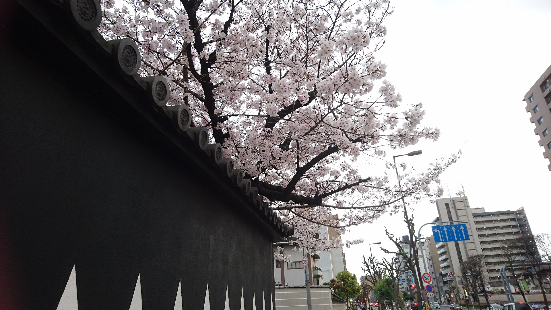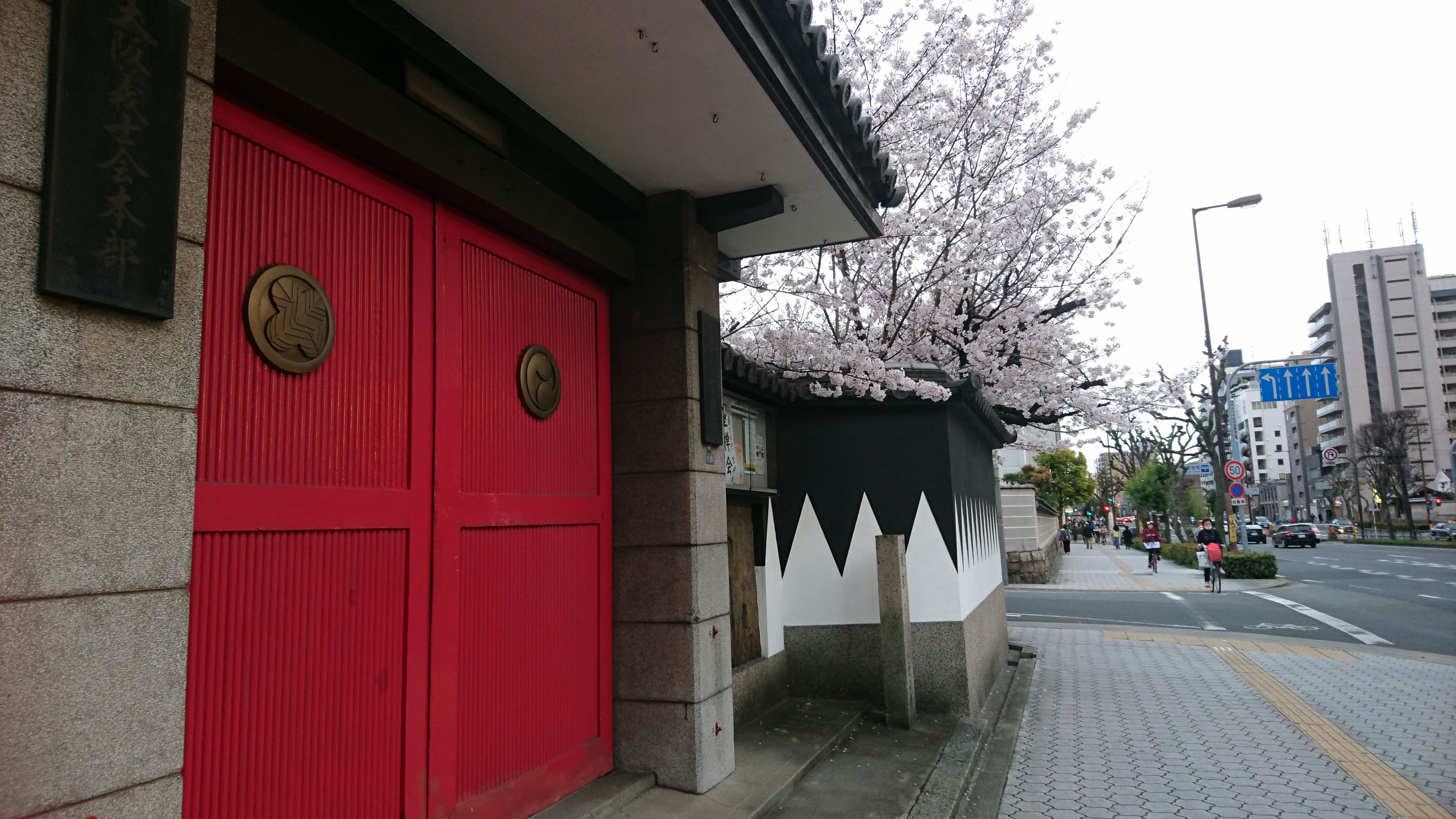 赤い門と外壁のギザギザ模様が特徴的で、その外壁を超えんばかりの桜。このコントラストがとても綺麗でした。