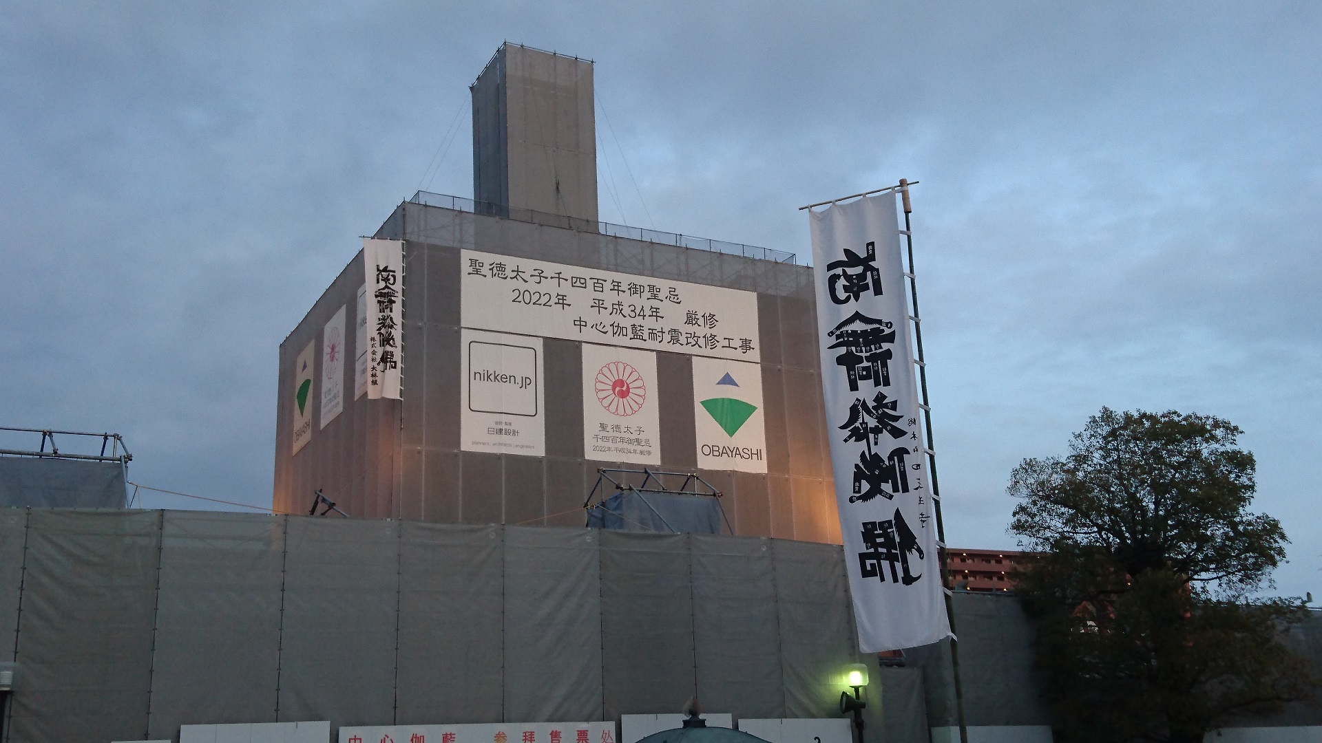 修復工事中でした。足場の様子からは上層階部分がまるまる無くなっているように見えますが、ほぼ全とっかえするのでしょうか。